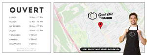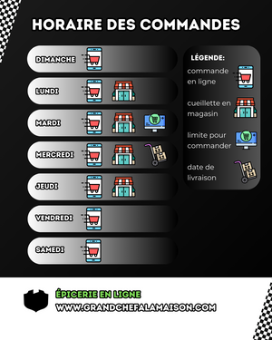 Pour des raisons de congélations et de logistique, la livraison n'est pas disponible pour le moment. Choisir la date et la plage horaire de votre Cueillette de commande à notre magasin. 15041 boul. Henri-Bourassa, G1G 3Z2
